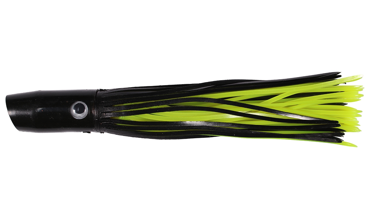 Plunger style skirted fishing lure which creates a huge smoke trail & may be trolled in any position. Head is weighted to keep the lure tracking true in all weather conditions & over a wide range of speeds. From the USA's Mold Craft Fishing Products.