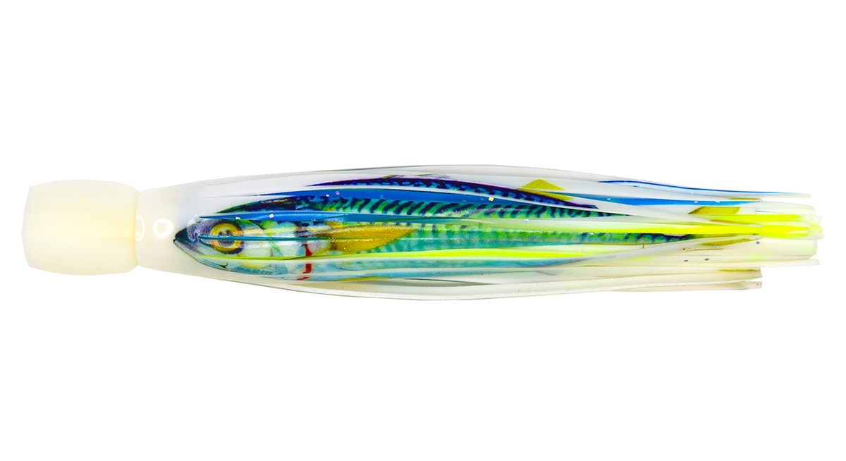 Game fishing lure from Peter Pakula in micro cockroach pattern. featuring a 3D printed head with Venturi jets & skirted in vibrant fish print skirts with UV & lumo blue glow additives to imitate baits specifically targeted by billfish & tuna. LURE LENGTH 175mm.