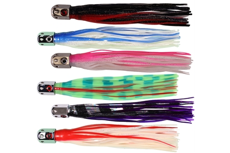 A set of six high speed, straight running skirted lures, ideal for targeting wahoo or tuna. Lure heads are chromed hexagonal shape with tapered nose & cup face & external jet ports. Optional rigging is available (sold separately).
