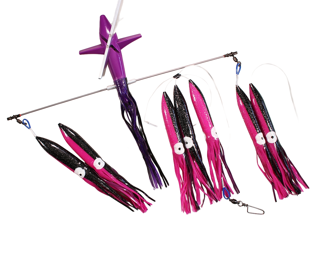 460mm wide titanium spreader bar game fish teaser with hummingbird, and rigged with 9in-230mm tube squid. A vane is fixed to the hummingbird belly to provide options of either PORT or STARBOARD swimming. Includes mesh storage pouch.