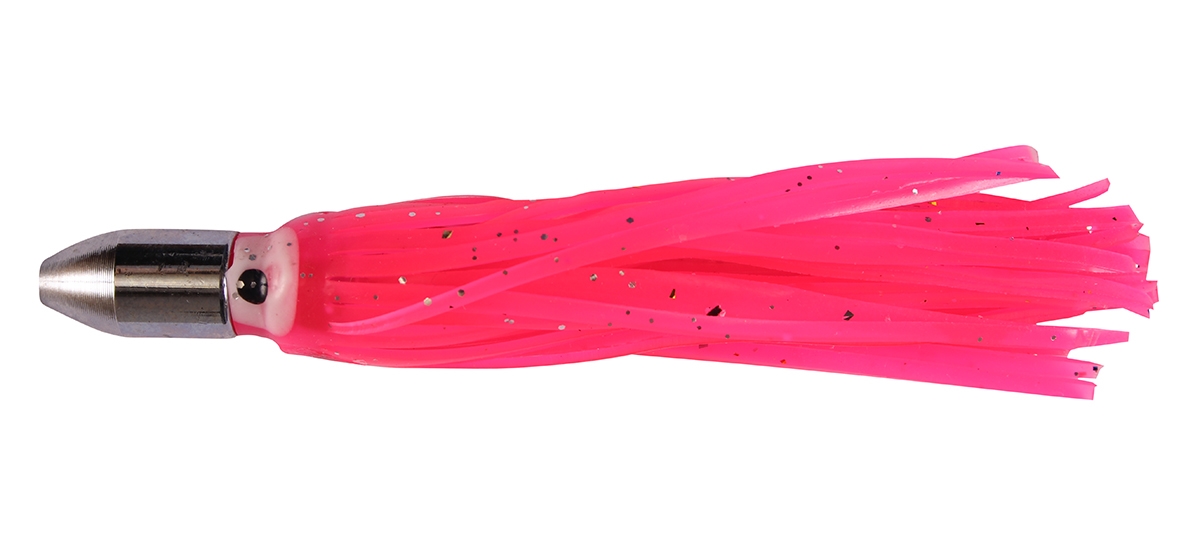 Small, budget priced classic straight running skirted tuna lure, fitted with two pink skirts. Bullet shaped chrome plated brass for fast easy trolling in any position or conditions. Lure length 115mm (4-1/2").